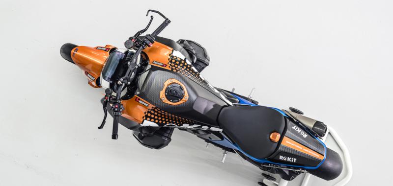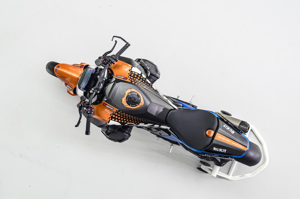 En el plano técnico, la preparación va mucho más allá de lo estético. Incorpora una horquilla invertida Wilbers totalmente ajustable —alargada 30 mm para aumentar el ángulo de inclinación—, amortiguador trasero específico y una ligera rueda delantera de carbono heredada de la BMW M 1000 RR. A ello se suma un amplio uso de fibra de carbono, escape Akrapovič de titanio con silenciador en carbono y componentes mecanizados que refuerzan su enfoque supersport. El resultado es una custom roadster capaz de rozar los 275 km/h y ofrecer sensaciones propias de una superbike.