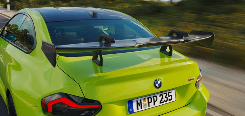 El elemento más llamativo es su nuevo alerón trasero de tipo “cuello de cisne”, una solución heredada directamente de los programas de competición cliente de BMW M, como el BMW M4 GT3. Este alerón no solo es ajustable manualmente en el ángulo de ataque, sino que incorpora un exclusivo Race Mode, que lo retrasa 50 milímetros para maximizar su eficiencia aerodinámica en circuito. En configuración Street Mode, su posición cumple con la normativa alemana de homologación.