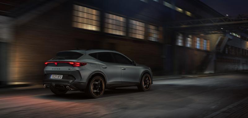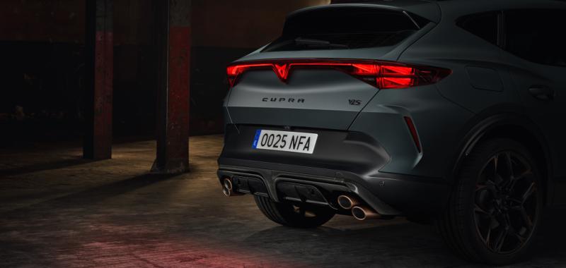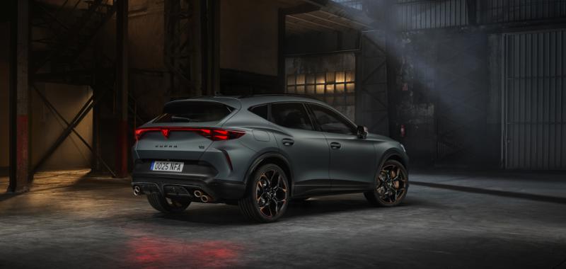 El diseño exterior también refuerza su carácter deportivo. El CUPRA Formentor VZ5 incorpora paragolpes específicos, llantas exclusivas y elementos en fibra de carbono como el splitter delantero y el difusor trasero, además de un sistema de escape con cuatro salidas en disposición diagonal que subraya su personalidad radical.