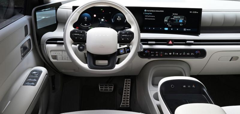 El nuevo NEXO presenta un ambiente más moderno y sostenible en su interior, gracias a la adición de materiales y acabados innovadores. Una de sus características más notables es una doble pantalla panorámica curva de 12,3’’, que combina la instrumentación con el sistema multimedia.
