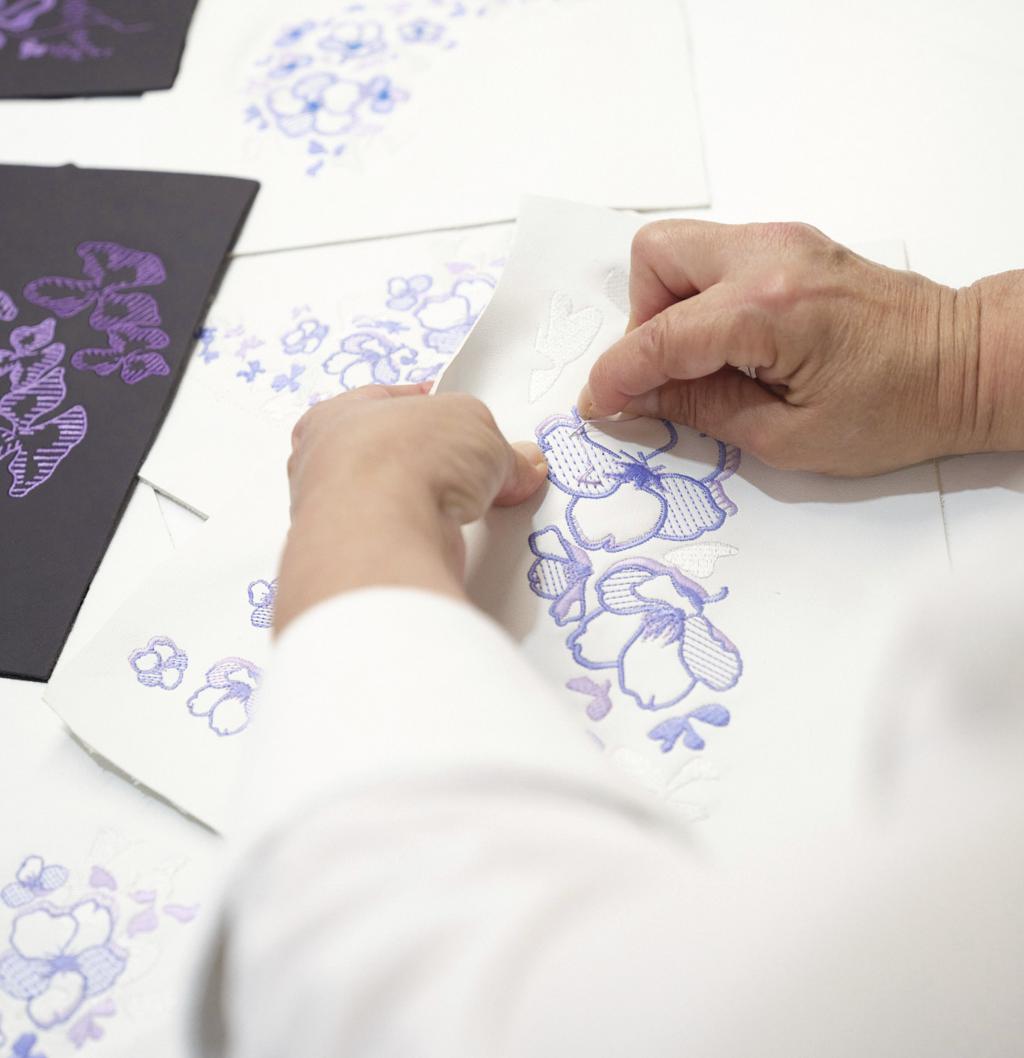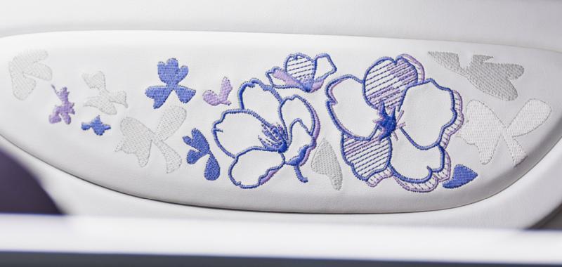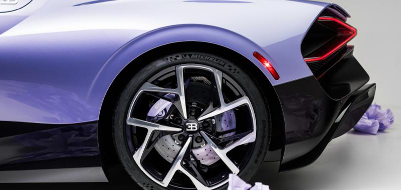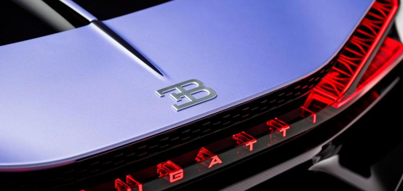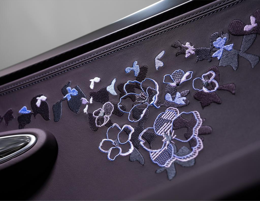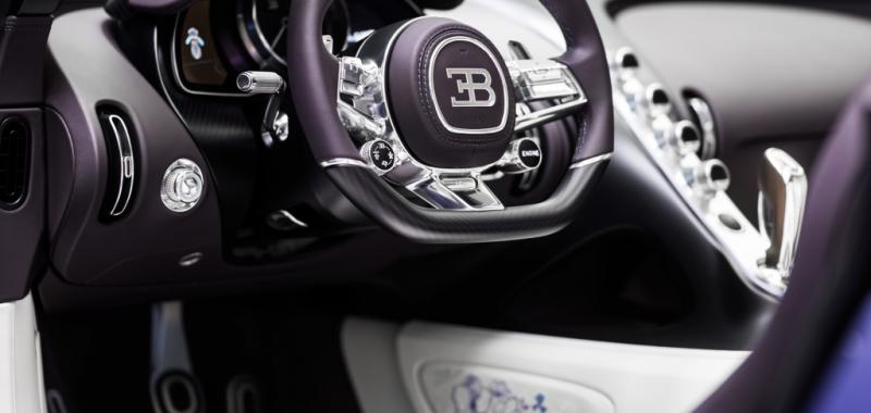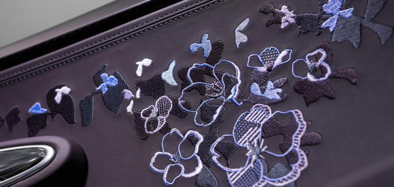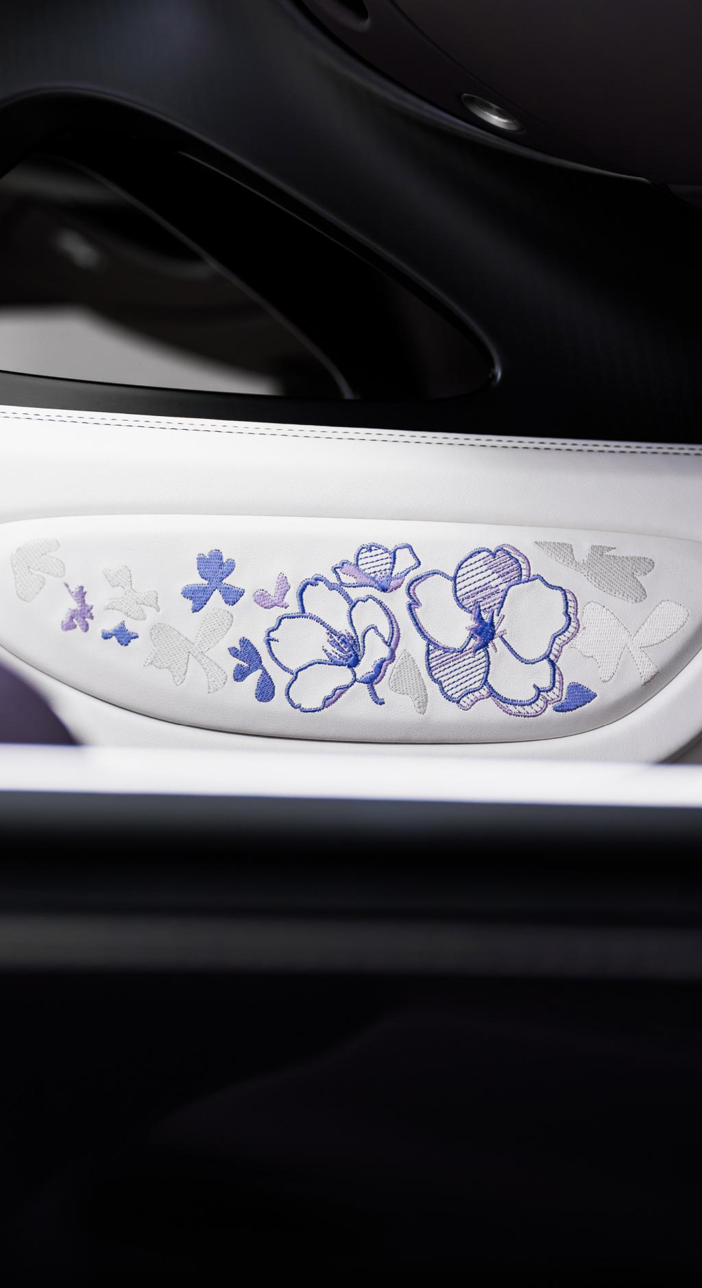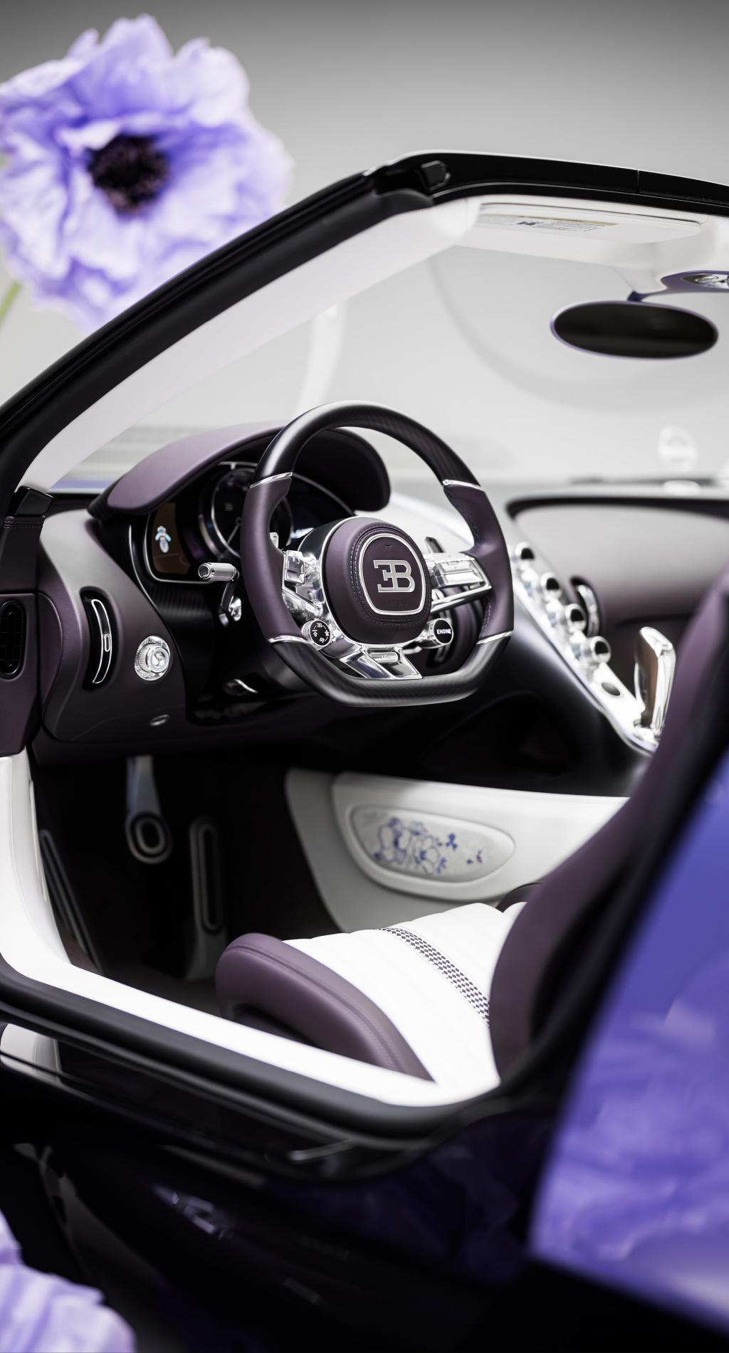 Uno de sus elementos más distintivos es el alerón trasero, decorado a mano con un elaborado motivo floral en tonos lila e iris, que convierte al coche en un auténtico lienzo artístico. En el interior, la atmósfera es igual de refinada: cuero en tonos claros y oscuros, detalles en violeta y complejos bordados florales realizados a mano, que aportan textura y exclusividad. Además, el icónico “Dancing Elephant” de Rembrandt Bugatti en el selector de marchas refuerza el vínculo con la herencia artística de la marca.