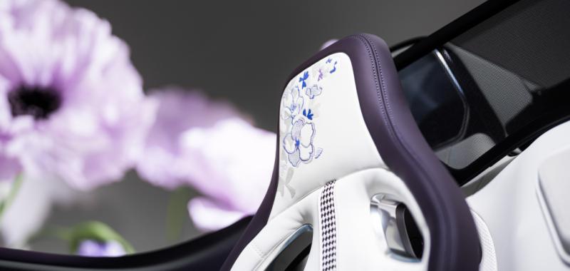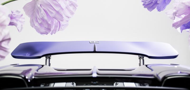 Concebido como un homenaje personal, su diseño se inspira en la delicadeza de las flores, la elegancia de la alta costura y el simbolismo emocional de su nombre. En el exterior, destaca su pintura única en tono “Lavender”, desarrollada específicamente para este vehículo, que cambia sutilmente según la luz. Este acabado se combina con fibra de carbono en tono violeta, aportando contraste y profundidad visual.
