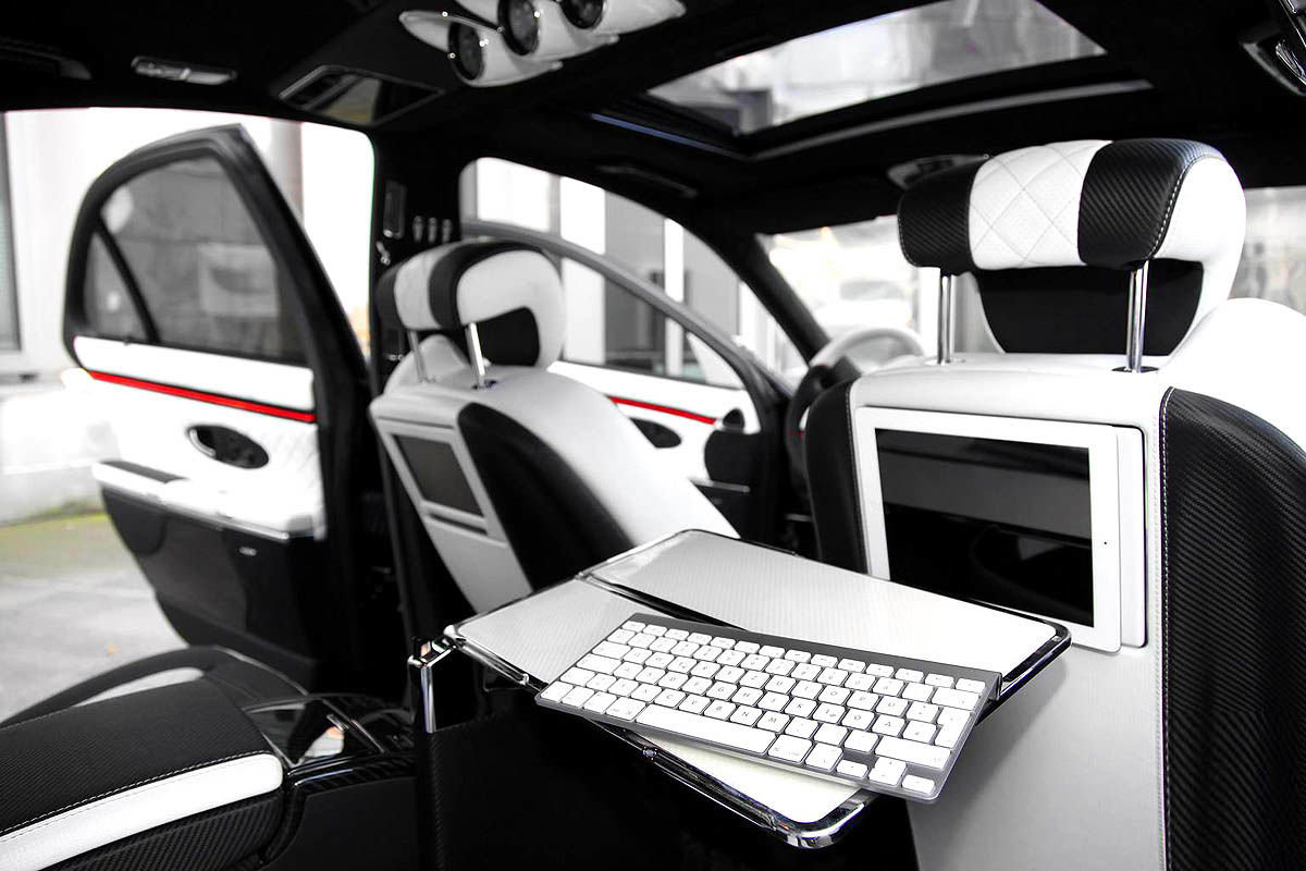 Otras de las exquisiteces que monta el vehículo son: un conjunto de pinzas en blanco para las llantas de aleación de 24" compuestas por fibra de carbono. Además se ha equipado una suspensión de regulación eléctrica y grupos ópticos con tecnología LED de última generación. Por toda la carrocería se aprecian las incursiones de fibra de carbono, aportando una estética muy deportiva y exclusiva. Eso sin contar con la reducción de peso que esto supone.