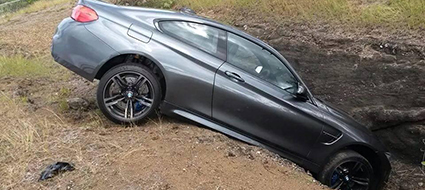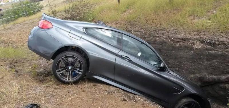 BMW M4 accidentado en una cuneta.