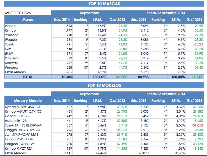 Durante el pasado mes de septiembre se han matriculado 10.585 motocicletas. Un 24,7% más que el mismo periodo del año anterior. Esto supone un aumento de casi el 20 por ciento en el acumulado del año. Las motos más vendidas son los scooter hasta 125, que supone mas de la mitad del mercado total. Sin embargo, los ciclomotores siguen sin levantar cabeza; sus ventas no crecen registrando una caida superior al 3 por ciento. De estos, el 86 por ciento son scooter.
