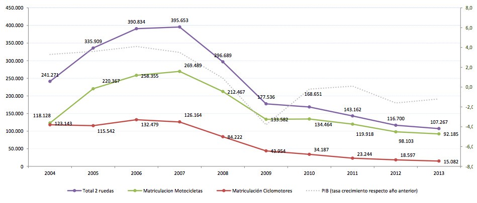 Si echamos una mirada atrás y nos fijamos en las ventas de los vehículos de dos ruedas en el año 2007 (año récord), la situación actual esta por debajo del cincuenta por ciento. Aquel año se vendieron más de 126.000 ciclomotores y 269.000 motos. Estamos hablando de más del doble. Por lo tanto, el hecho que mejores las ventas tras la penuria de los últimos años pasados, es un balón de oxigeno para un sector precario.