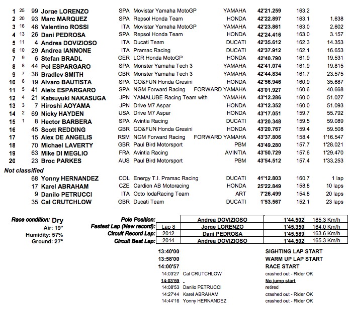 Rossi se había adelantado, lideraba la carrera con las Ducati de Iannone y Dovizioso, además de Lorenzo y Márquez detrás. Era cuestión de tranquilizarse ante el desarrollo del primer tercio de carrera. En la vuelta cuatro, Lorenzo adelanta a Valentino y lidera la competición, que no perdería hasta la entrada en la línea de meta. Lorenzo hizo una carrera excepcional. Una victoria muy merecida con la vuelta más rapida incluida.