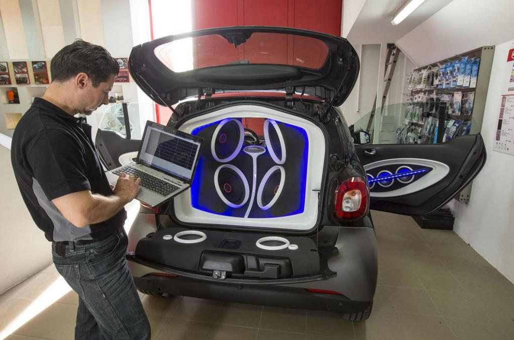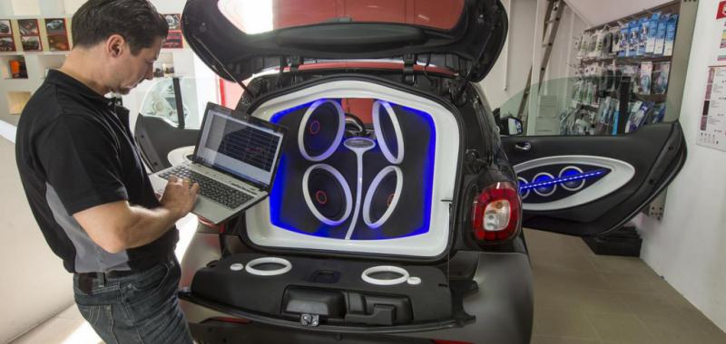 5,720 Watios de sonido dentro de un Smart Fortwo
