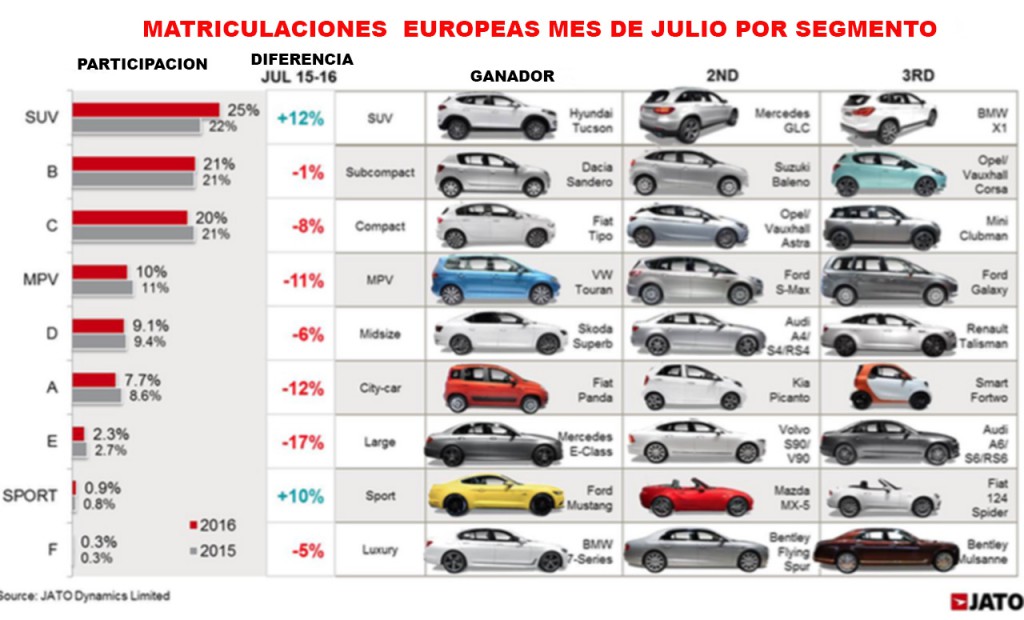 El segmento de los SUV sigue creciendo (+11,9%) en comparación con julio de 2015, lo que significa que ahora representa el 25,5% del mercado global, en gran parte debido al crecimiento entre los grupos D-SUV y C-SUV, a expensas del compacto , MPV y grandes segmentos Sedan / SW. El Nissan Qashqai mantuvo su posición como el SUV más vendido, el registro de 18.373 unidades, pero esto fue una caída de 6,9% en el mismo período del año pasado. Era sus rivales más nuevos como el Renault Kadjar, Hyundai Tucson y Kia Sportage, que impulsaron el crecimiento del segmento, registrando un aumento significativo de 127%, 586% y 24%, respectivamente. La nueva generación del Volkswagen Tiguan significaba el modelo revirtió la tendencia a la baja observada el mes pasado, la publicación de un pequeño aumento del 0,2%.