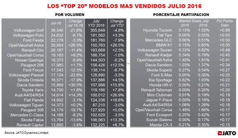 El Volkswagen Golf sigue siendo el modelo más vendido, con 36.540 unidades registradas en julio, pero su volumen se redujo considerablemente, lo que resulta en la cuota de mercado más bajo del modelo desde diciembre de 2012. Esta disminución coincide con el mayor rival de la modelo, la nueva generación del Opel / Vauxhall Astra convirtiéndose en el cuarto coche más vendido en Europa. Otros con dígitos negativos son los Ford Focus (-12.3%), Skoda Octavia (-17,9%), Peugeot 308 (-19,7%) y el Audi A3 (-25.9%).