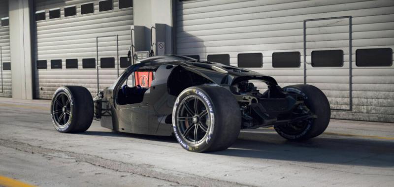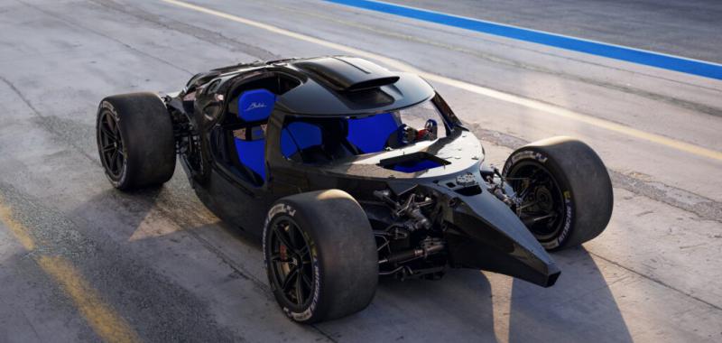 Detrás hay un grupo de instrumentos rectangular que contiene tres pantallas digitales cuadradas que muestran información como tiempos de vuelta y fuerzas G incrustadas en un marco que, como casi todo dentro del Bolide, está hecho de impresionante fibra de carbono.