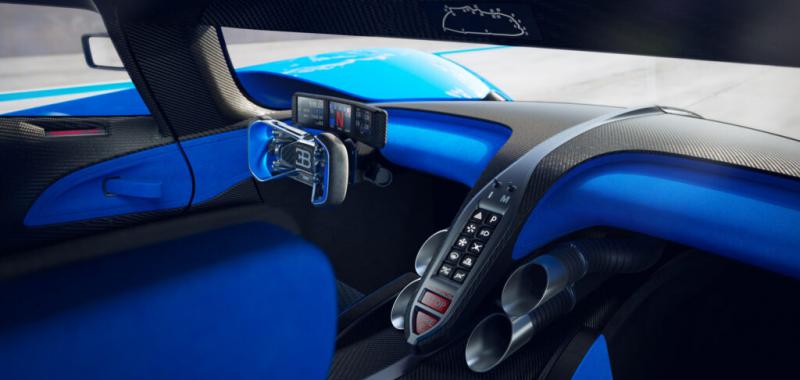 En realidad, los "tubos de escape" que se encuentran a cada lado de la consola no emiten humo del motor W16 de 8.0 litros y 1,578 CV. En su lugar, bombean aire fresco proveniente de un sistema de control de clima compacto. Además, en el riel de cabecera se encuentra una pantalla que muestra un mapa digital con el diseño de la pista.