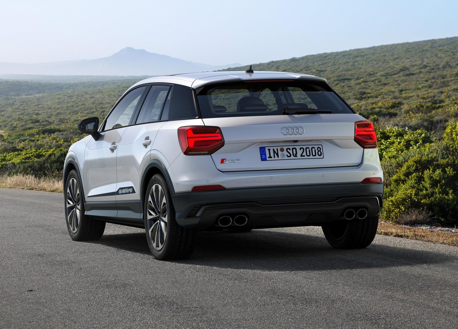 La marca de los aros ofrece dos paquetes para el SQ2. Con el paquete óptico de estilo negro/gris, la parrilla Singleframe, las rejillas de las entradas de aire y el difusor están acabados en negro/gris. El paquete exterior del SQ2 también aplica un acabado negro a las carcasas de los espejos retrovisores, a los blades en los pilares C y a las salidas de escape. El spoiler del techo cuenta con un contorno especial y logotipos quattro adornan las puertas.