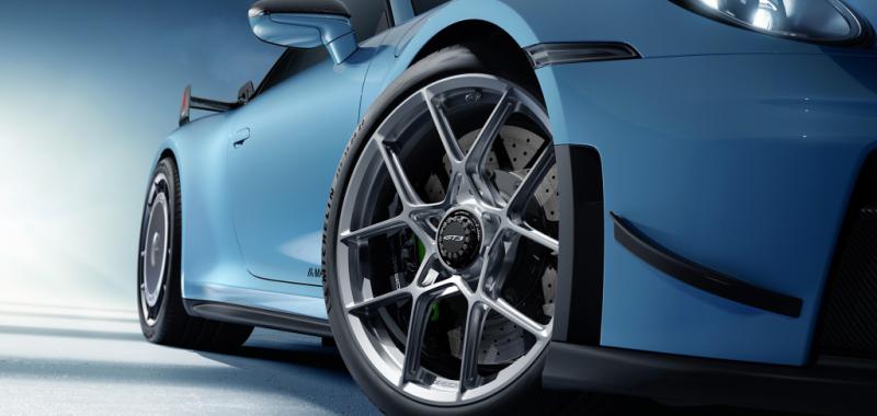 Respecto a las llantas, un conjunto ligero es proporcionado por Porsche, lo que permite una reducción de seis kilogramos en el peso no suspendido en comparación con las llantas convencionales. Este juego de llantas se encuentra diseñado para ser compatible con frenos específicos, los cuales están destinados a optimizar la precisión y el control durante el proceso de frenada.