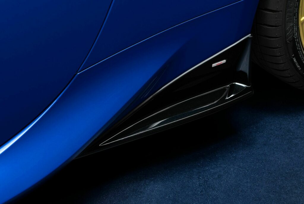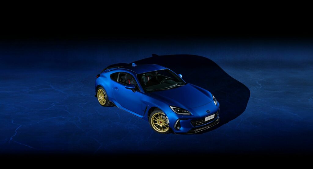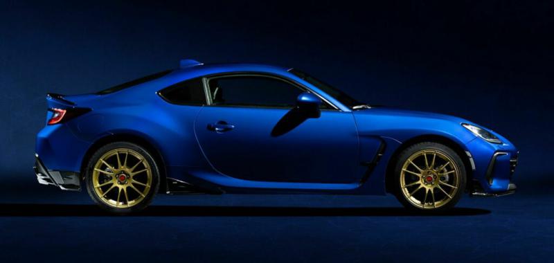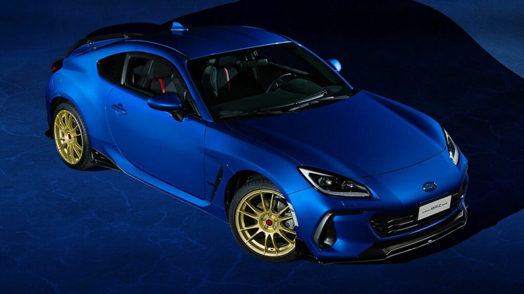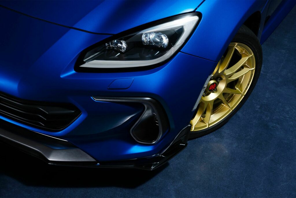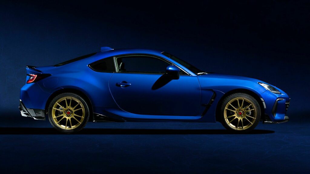 El BRZ Touge se presenta como una opción mucho más agresiva en comparación con el BRZ STI Sport y el BRZ tS, ambos con especificaciones JDM y estadounidenses respectivamente. En un llamativo tono Blu Pearl de Subaru, este modelo exclusivo cuenta con ruedas doradas OZ Superleggera de 18 pulgadas, resaltadas por tapas centrales rojas Touge. Además, se destaca por su prominente divisor delantero, faldones laterales firmados por STI, extensiones del parachoques trasero, un difusor y un alerón trasero.